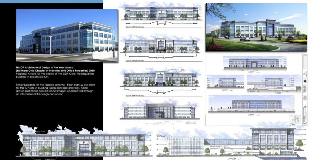 While working as the Senior Designer for this project teamed with a great Project Manager at a great firm in Northeastern Ohio, our firm was hired by @PremierDevelopment to design this 177,000 sf, five-story building that dwarfed existing twin headquarters buildings on @SiteCenters campus. Upon completion of sketches, 2D Autocad drawings, and 3D renderings, a team of colleagues produced the construction documents. This award-winning corporate headquarters design included the following features: