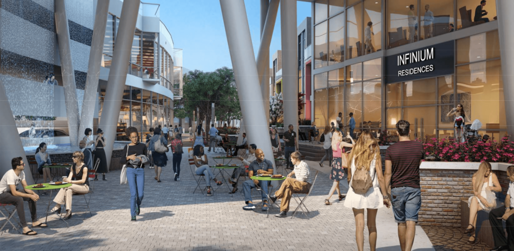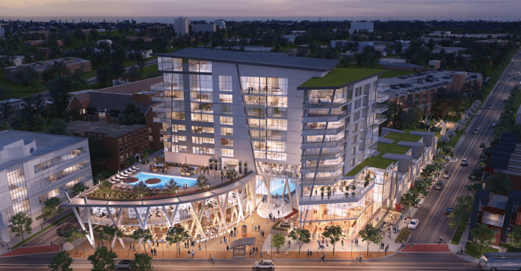 This destination development features a promenade central core, condominiums, apartments, single family townhomes, a variety of commercial space, lavish residential amenities, structured parking, and a pleasant public transit waiting environment. This project was designed in 2017.